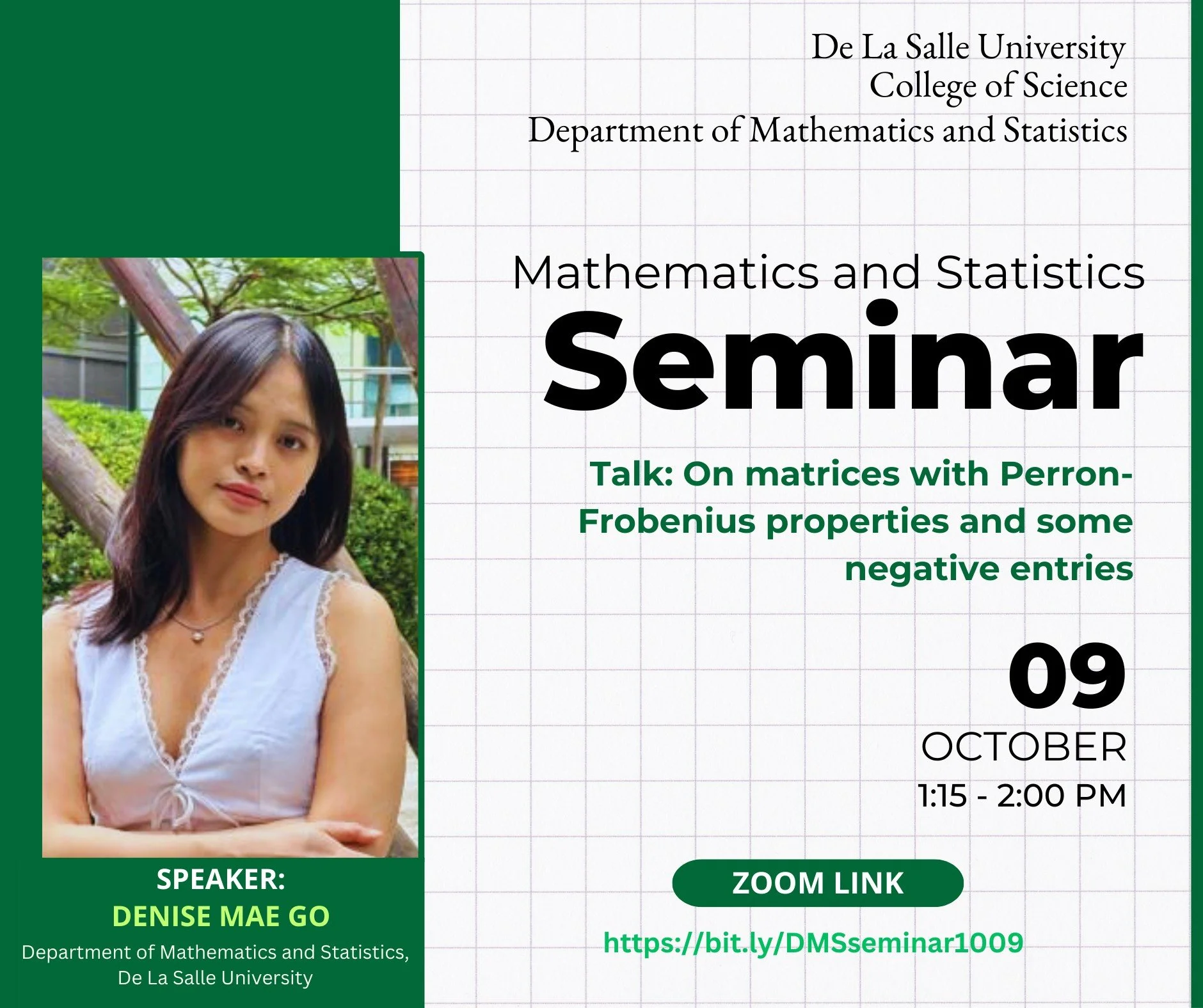 The DLSU Mathematics and Statistics Seminar is an online lecture series that began in Term 3 of AY 2023–2024 and runs for three to four sessions per term. The goal of the seminar is to introduce undergraduates to a broad spectrum of topics in mathematics, statistics, and related disciplines, with some talks being expository in nature. Speakers range from experienced researchers to promising undergraduates, and invitations reflect a commitment to diversity in research areas, institutions, gender, and background.